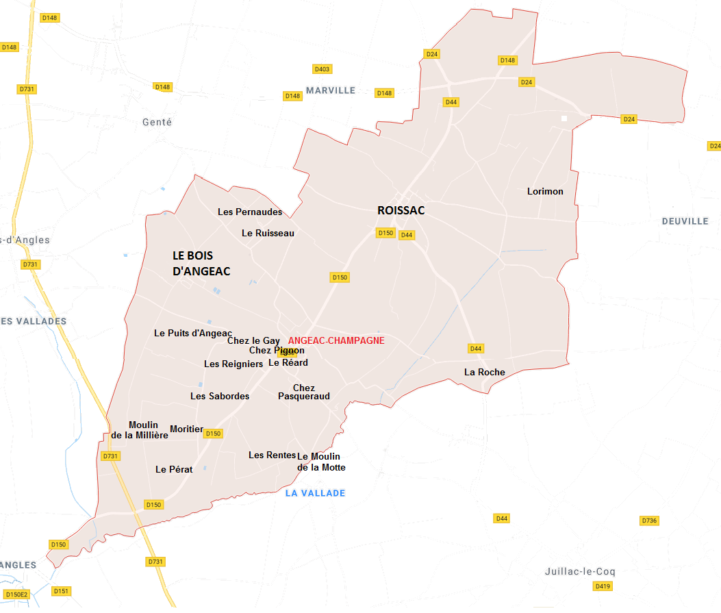 Elle est constituée des villages d’Angeac-Champagne et de Roissac. Ses habitants sont appelés les Angeacais et Angeacaises.