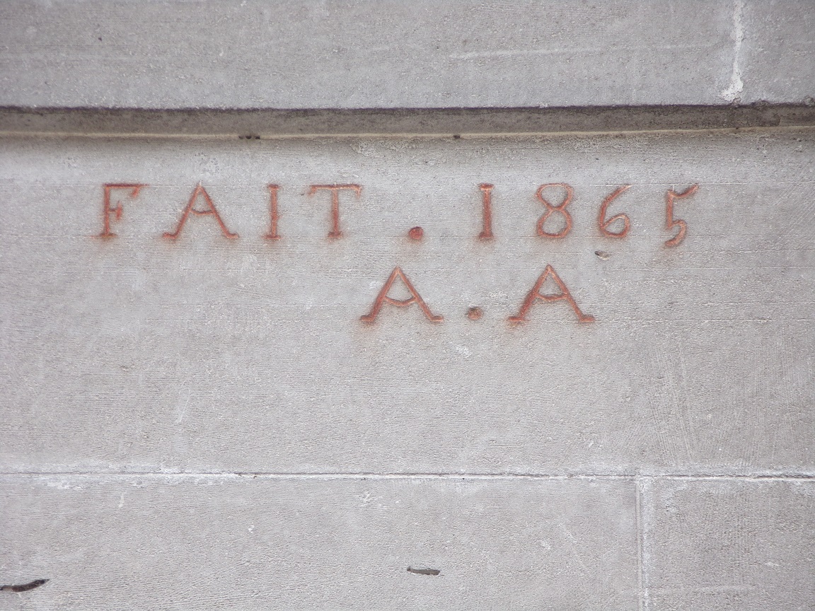 La simple observation indique que les parties les plus anciennes sont, au sud : deux corps de bâtiments bas, aux ouvertures petites, pour plusieurs d’entre elles à encadrement à arêtes abattues en chanfrein et disposées sans régularité , s’y font face. Celui qui borde la rue et qui est certainement une ancienne habitation, présente à l’arrière deux inscriptions : l’une, 161., semble correspondre à une construction dont les baies chanfreinées pourraient être les vestiges, l’autre, AN 1748, pourrait être la date d’une transformation ou d’un agrandissement de ce corps de bâtiment.