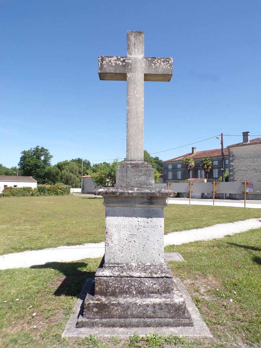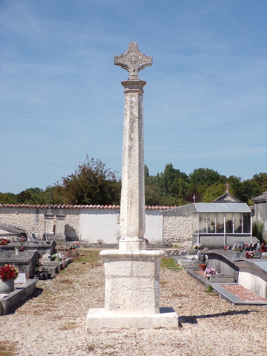 Croix de cimetière édifiée entre 1883 et 1886, en même temps que la construction du cimetière, réalisée par l’entrepreneur de maçonnerie François Gibrenne, d’après le projet de l’architecte cognaçais Louis Aunis.