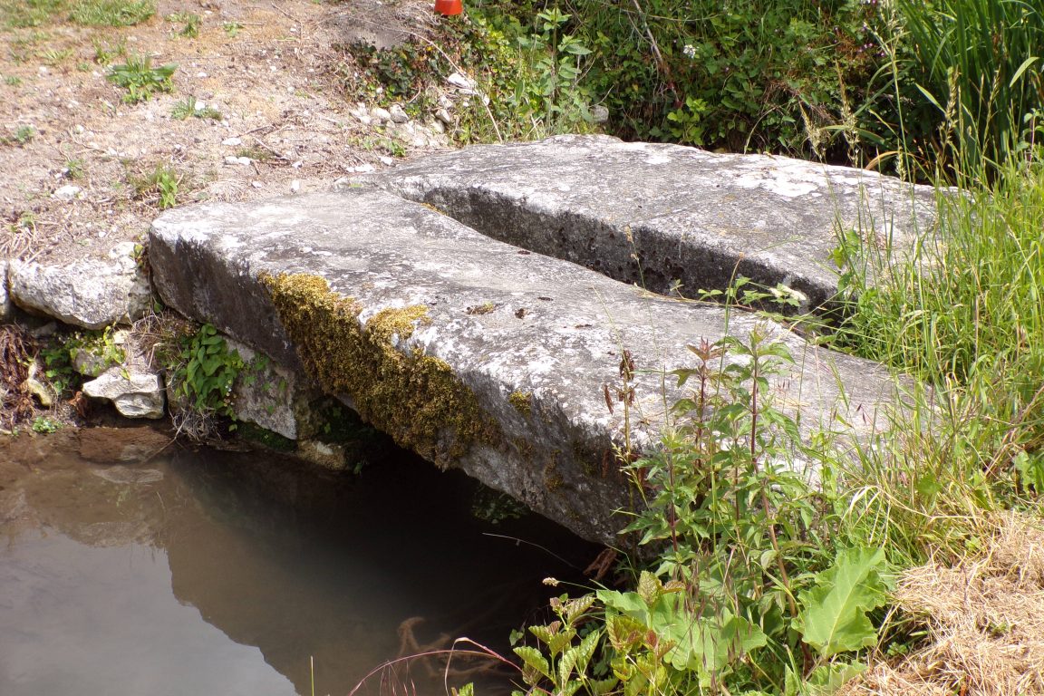 Petit bassin rectangulaire, en contrebas de la route, fond dallé en pierres, deux margelles en pierre, alimenté par une fontaine. Eau très claire.