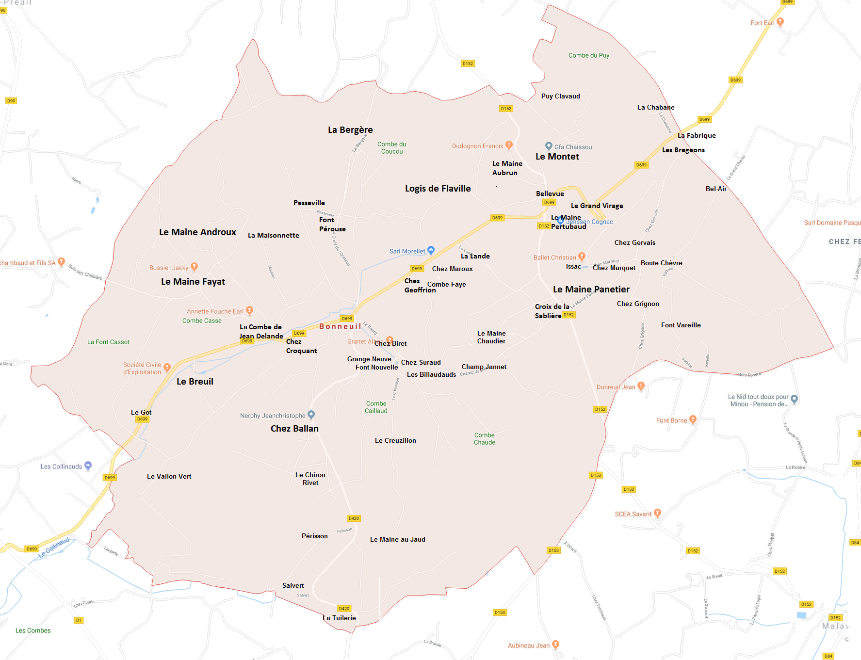 La commune comporte de nombreux hameaux et fermes : le Montet, la Bergère, le Maine Fayat, le château du Breuil, chez Biret, chez Ballan, chez Maroux, le Maine Panetier, le Logis de Flaville, le Maine Androux, etc. Le bourg n’est pas plus gros qu’un de ces hameaux.