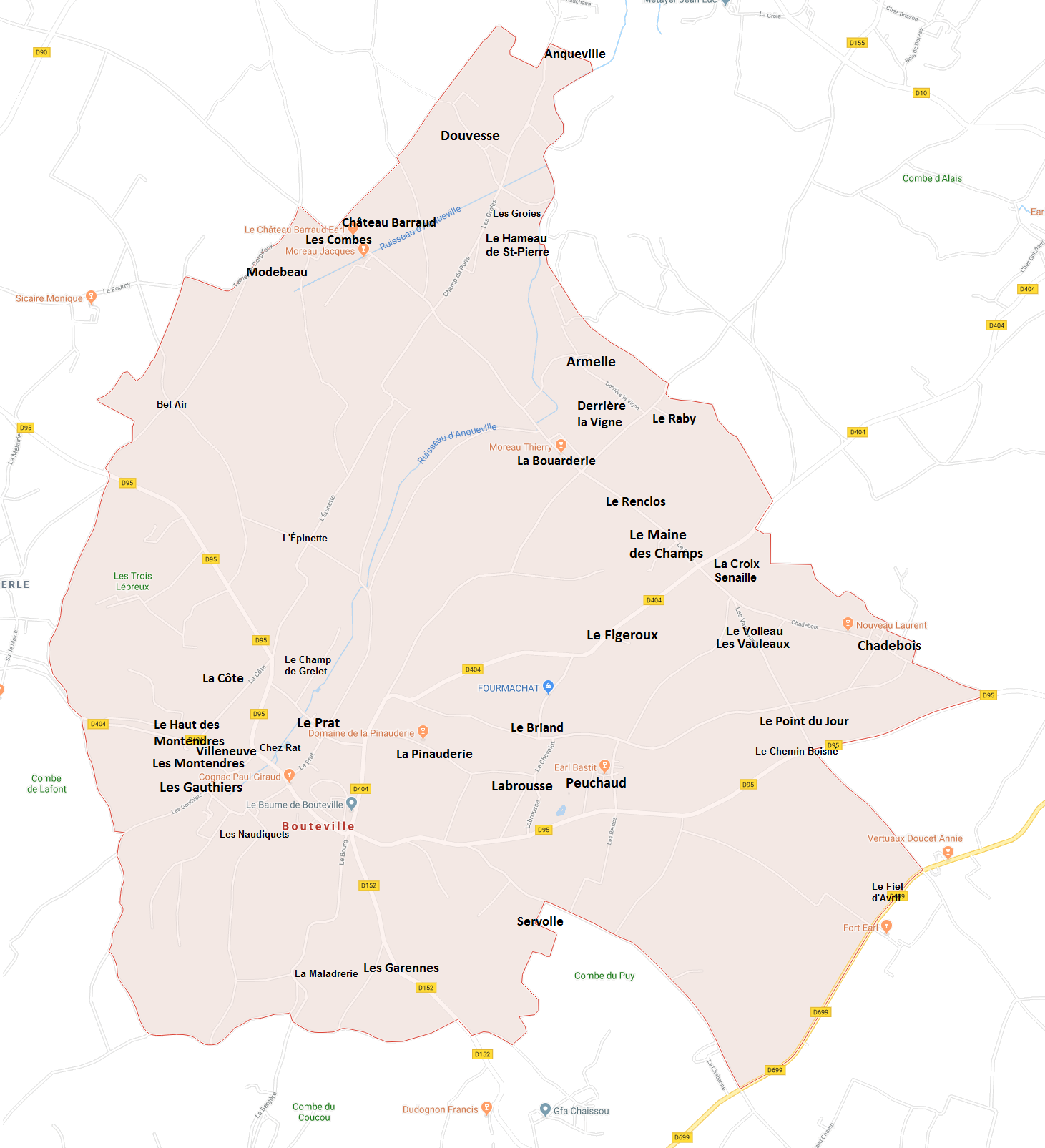 Peuchaud et Labrousse sont près de la route de Châteauneuf, Chadebois, limitrophe de la commune de Châteauneuf et le Figeroux, sur le chemin d’Angeac-Charente.