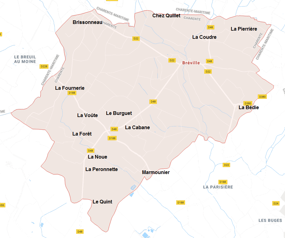 Ainsi, outre le chef-lieu de commune de Bréville, les hameaux de la Voûte, la Cabane, la Forêt, la Coudre sont parmi les plus importants de ce finage communal dont la superficie de 1539 hectares en fait une commune assez étendue en Charente.