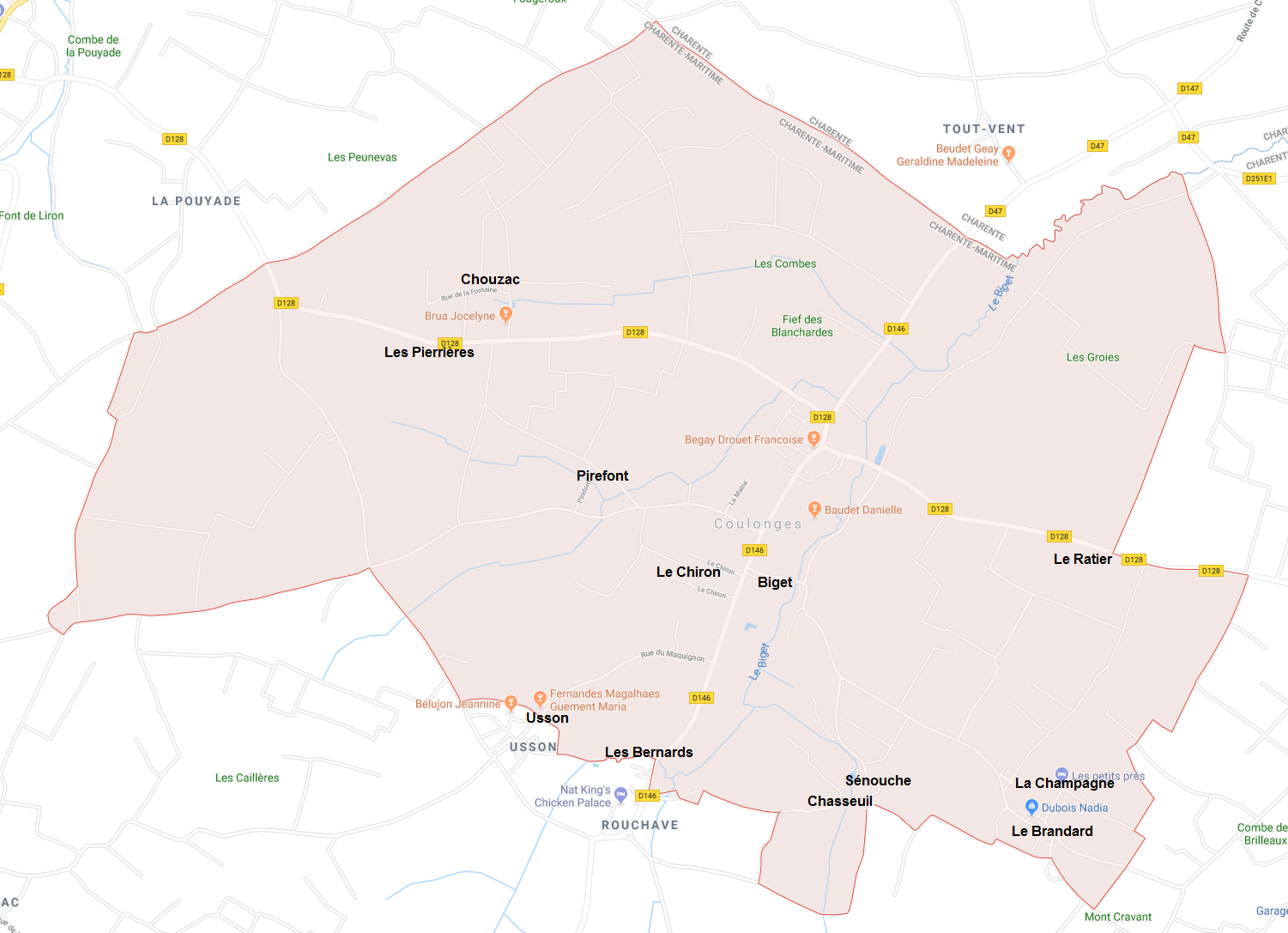 | Biget Chasseuil Chouzac La Champagne Le Brandard Le Chiron | Le Ratier Les Bernards Les Pierrières Pirefont Sénouche Usson |