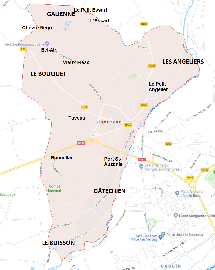 | Bel-Air Chèvre Nègre Galienne Gâte-Chien L’Essart Le Bouquet Le Buisson Le Petit Angelier | Le Petit Essart Les Angeliers Montsanson (Sommet montagneux) Port Saint-Auzanie Roumillac Taveau Vieux Fléac |