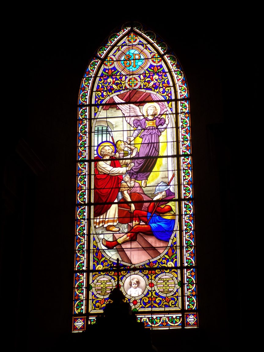 Sous la fenêtre nord du choeur, un autre vitrail, dédié à Saint Jean l’évangéliste a été offert par la même famille en mémoire de leur enfant, Jean Louis Paul Claude Boucher, décédé en bas âge.
