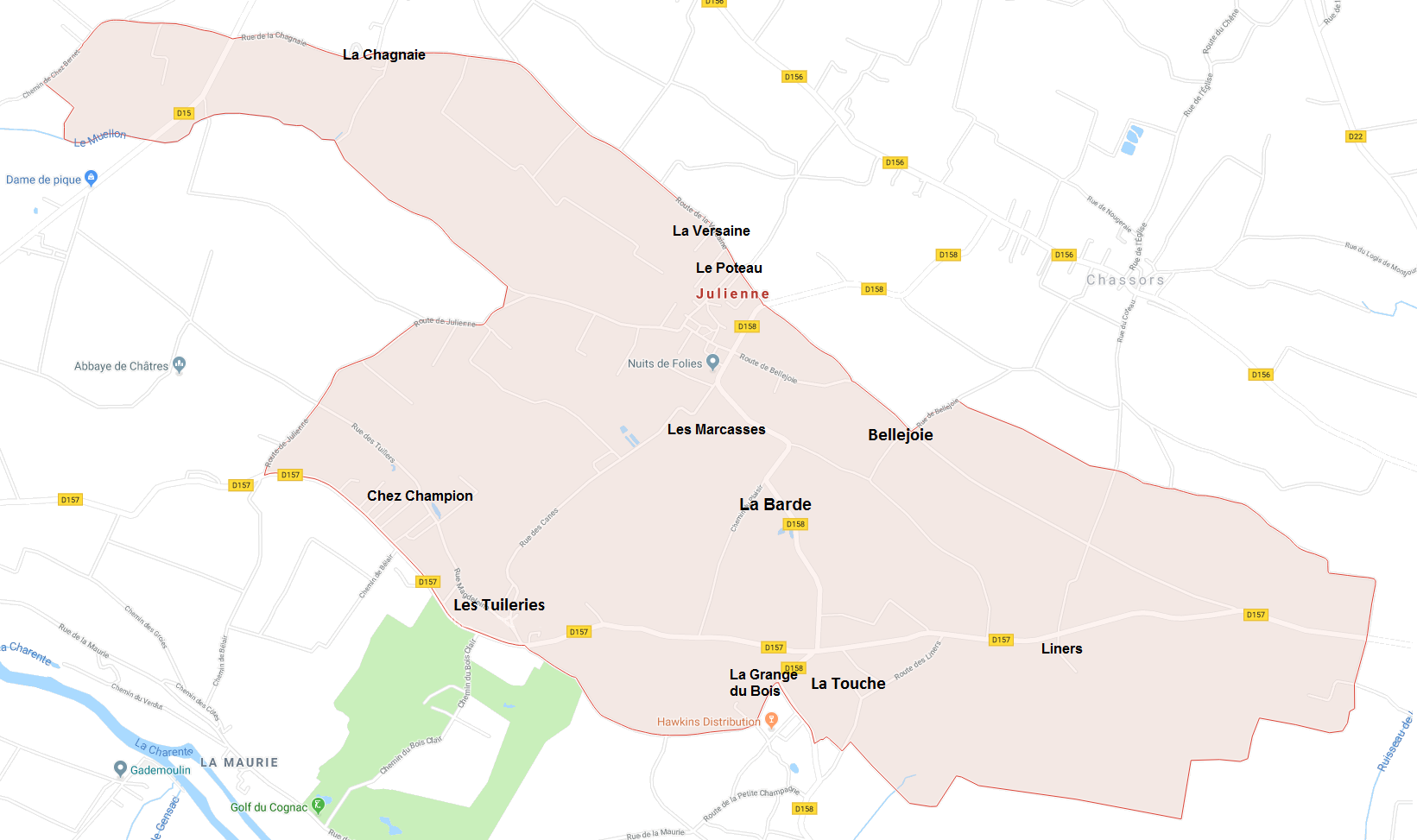 Le bourg de Julienne est aussi situé à 8 km à l’est de Cognac et 30 km à l’ouest d’Angoulême.