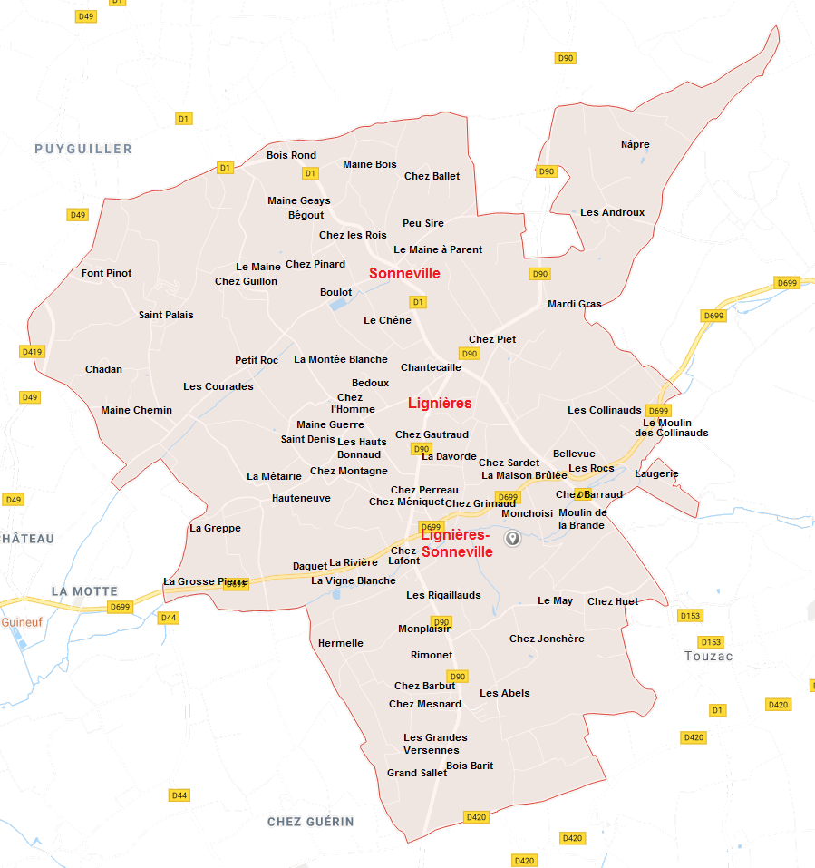 Lignières-Sonneville résulte de la fusion de Lignières et de Sonneville en 1845.
