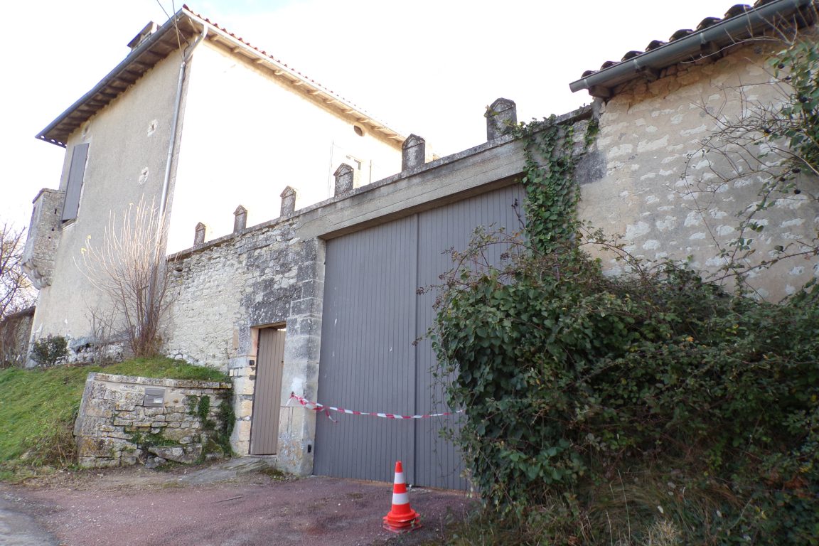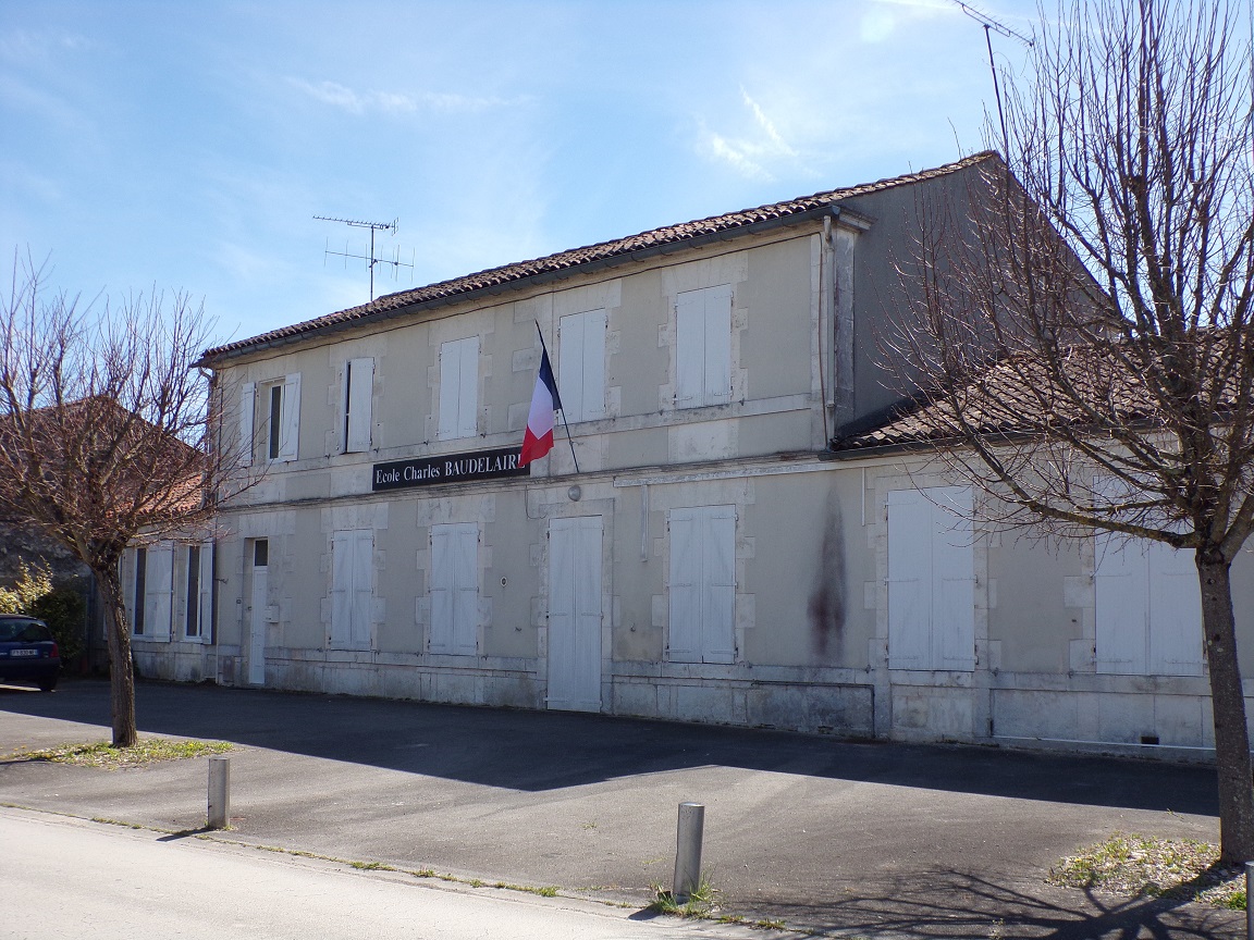 Mairie, Ecole – à Salle des fêtes (école Charles Beaudelaire) – Construction en 1841 et 1842 par Rousselet, entrepreneur à Gondeville, sur plans de Paul Deménieux, architecte. De 1891 à 1896, travaux par Lestrade aîné, entrepreneur de maçonnerie à Bouthiers, sous la direction d’Isidore Brunetaud, architecte à Cognac : surhaussement de la mairie et construction d’une nouvelle classe, d’un préau et d’un logement. De 1938 à 1940, construction d’un réfectoire.