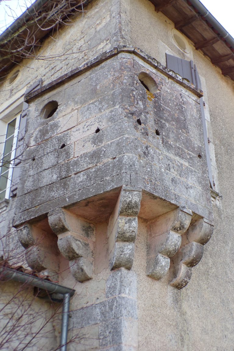 De plus, une sorte de petit poste d’observation a été placé en encorbellement à l’angle nord-ouest de l’habitation, soutenu par cinq consoles moulurées. La maison a deux étages dont un surcroît éclairé par des oeils-de-boeuf. Elle est couverte d’un toit à quatre pans. Les baies sont distribuées de façon dissymétrique autour d’une porte d’entrée en plein cintre surmontée d’un oeil-de-boeuf. Les fenêtres ont des appuis saillants et moulurés. Des oeils-de-boeuf moulurés éclairent les combles au-dessus des trois fenêtres de l’étage. A l’intérieur se trouvent un large escalier de pierre très usé à volées droites, des portes en plein cintre, un carrelage de terre cuite ancien, une grande cheminée de pierre. Les communs contiennent un pigeonnier attenant avec une charpente ancienne.