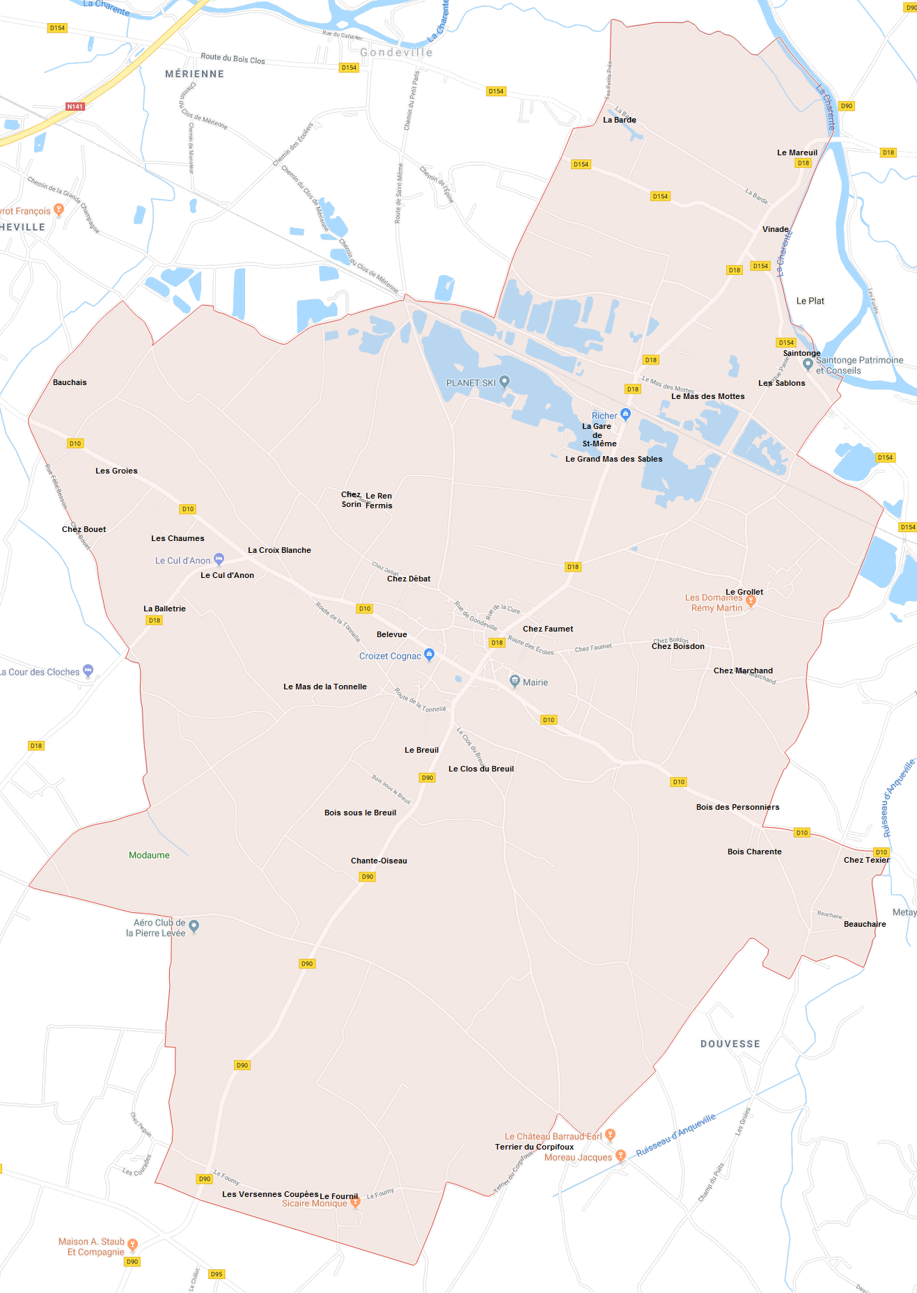 Au nord de la commune se trouvent la Barde, et, près de la Charente, Vinade et Saintonge. Plus au sud, s’échelonnent d’ouest en est, Bauchais, chez Bouet, puis autour de Saint-Même, le Renfermis, chez Breton, chez Débat, les Jacquemain, le Dorland, la Tuilerie, chez Butté, le Breuil, la Cure du Collège, et plus à l’est, chez Faumet, chez Boisdon, chez Durand, le Grollet, chez Marchand, enfin, chez Texier, Beauchaire et Anqueville en limite de commune.