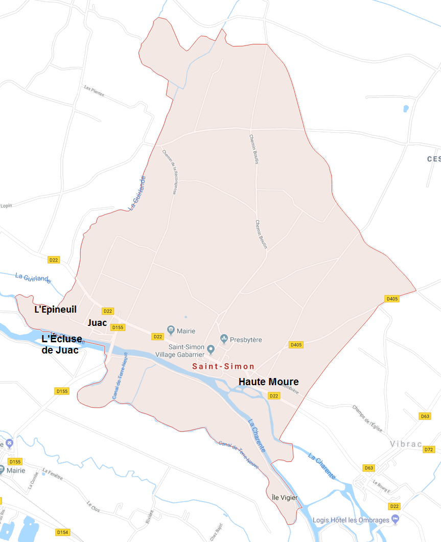 À 1,5 km de Vibrac, Saint-Simon qui s’appelait autrefois Saint-Sigismond, échelonne ses maisons le long du fleuve. Son bourg est aussi à 8 km à l’est et en amont de Jarnac et 20 km à l’est de Cognac.