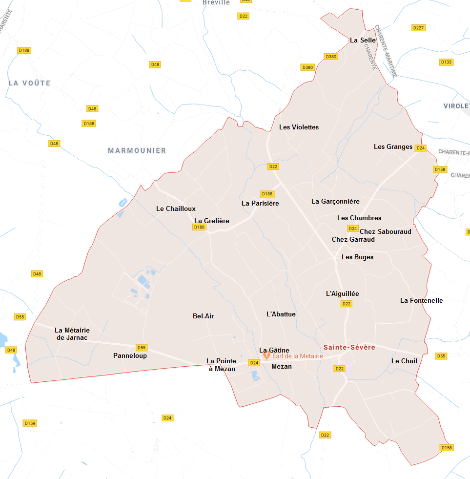 Sainte-Sévère est une commune de l’ouest de la Charente limitrophe avec la Charente-Maritime, située à 9 km au nord-est de Cognac et 33 km à l’ouest d’Angoulême.