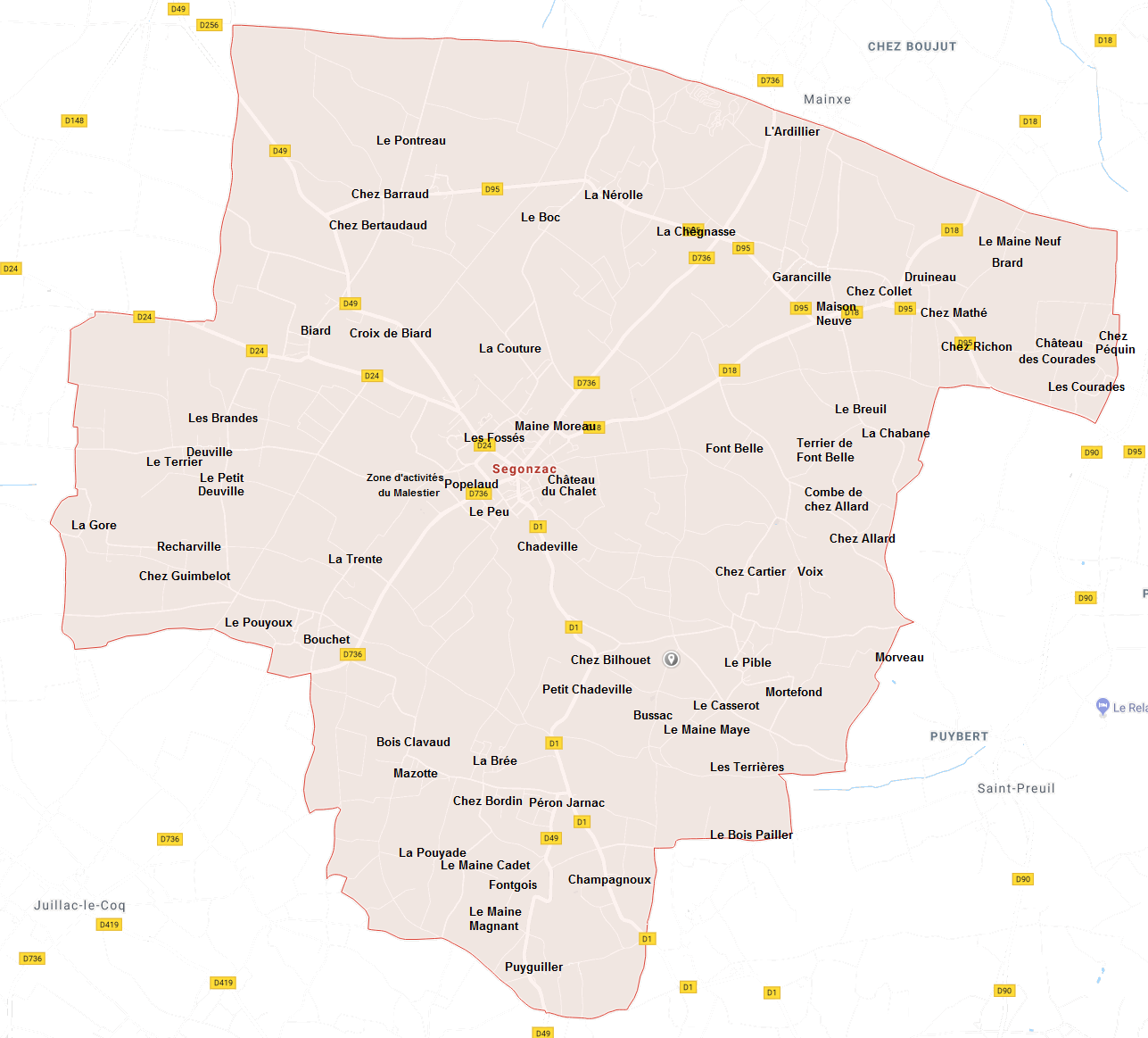Segonzac est aussi à 8 km au sud de Jarnac, 13 km à l’ouest de Châteauneuf et 17 km au nord de Barbezieux.