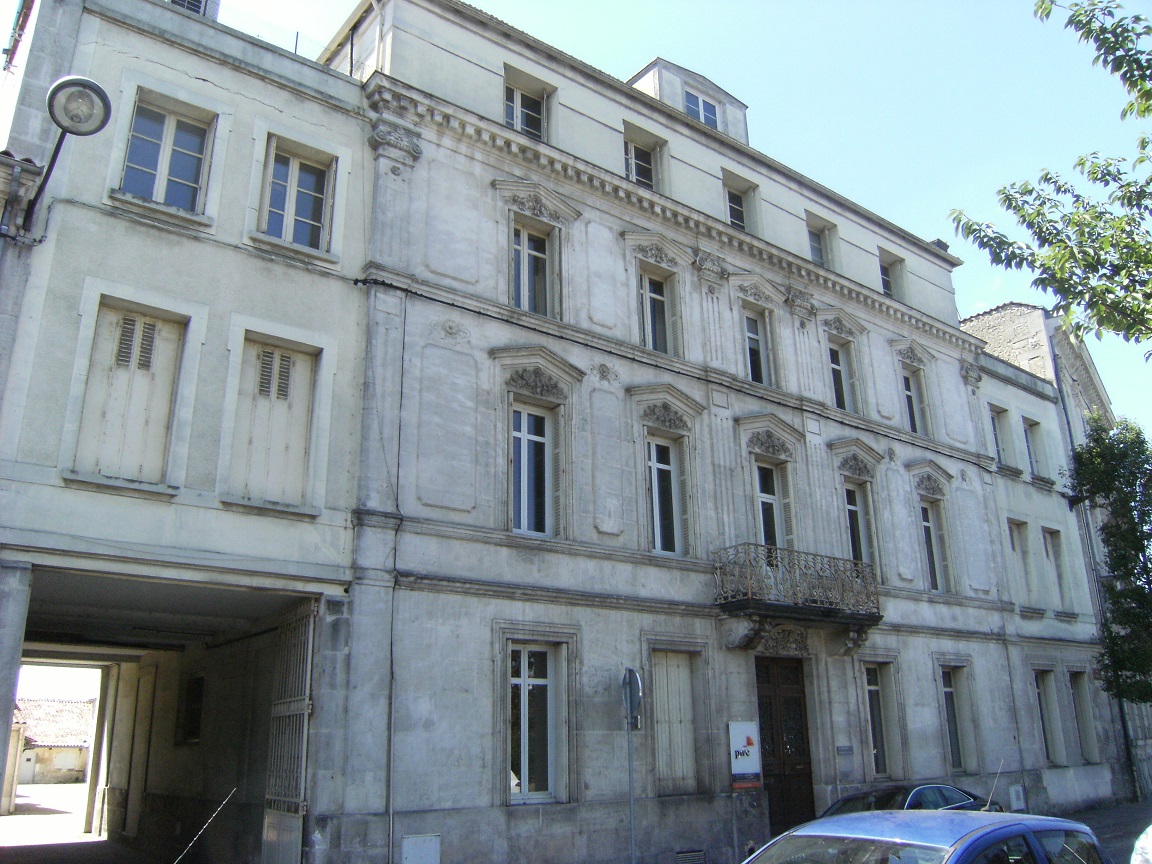 Hôtel de négociant en eau de vie construit vraisemblablement entre 1850 et 1875 ; surélevé d’un étage vers le milieu du XXe siècle et agrandi latéralement à la même époque, l’hôtel est ensuite divisé en appartements par l’architecte Fouquet.