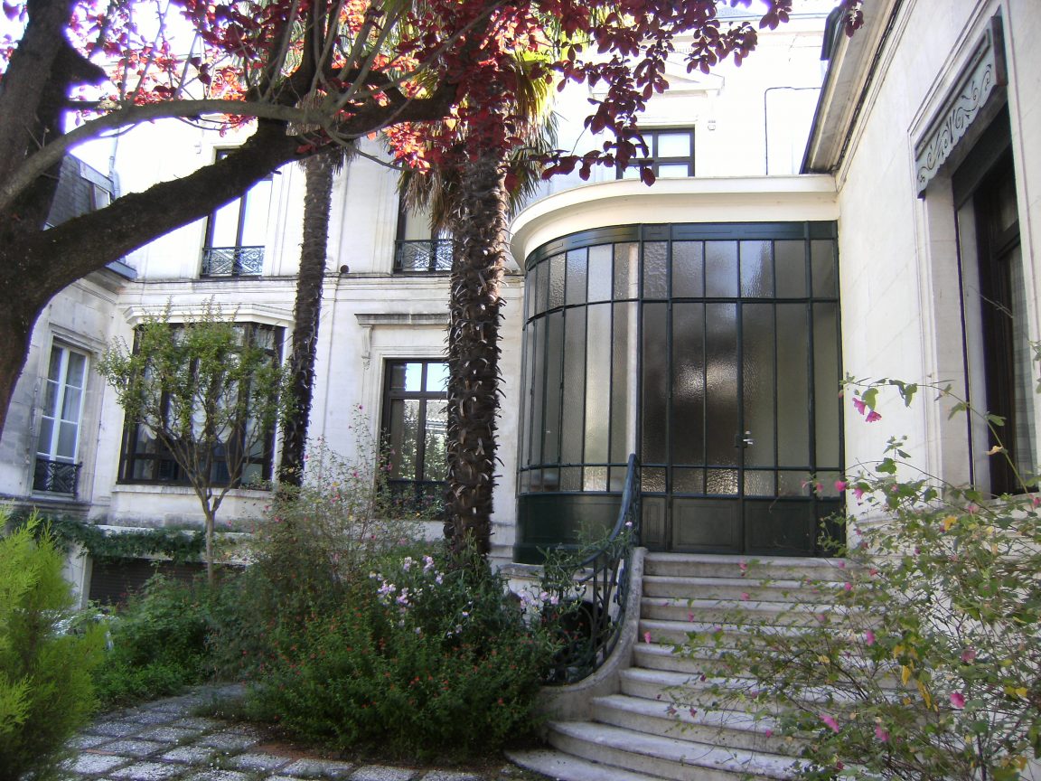 La verrière, élément en vogue dans la seconde moitié du XIXe siècle et originaire d’Angleterre, permet de situer la construction de cet hôtel aux alentours de 1880. Si le muret et le portail donnent l’impression d’un espace clos, la grille en ferronnerie témoigne de la volonté que l’hôtel soit vu depuis la rue.