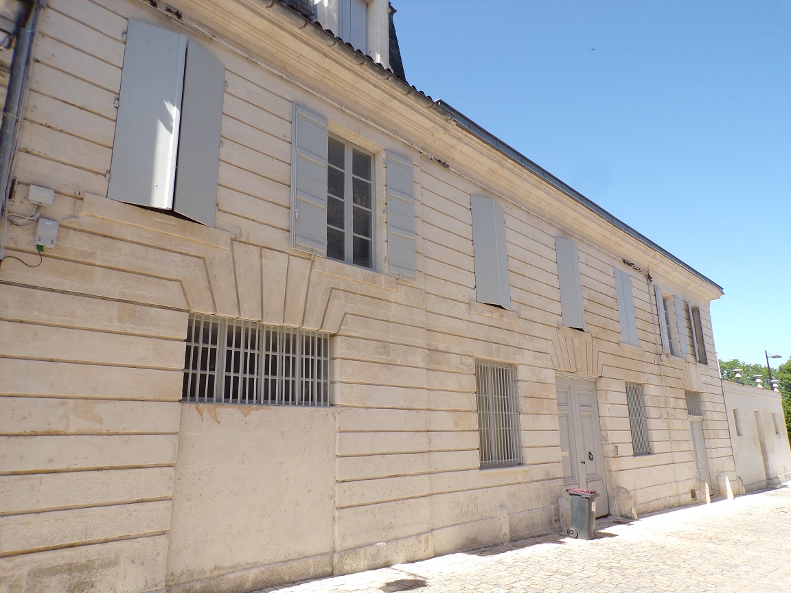 Le rez-de-chaussée a été aménagé en chai. On peut remarquer des consoles ça et là, des anciennes poutres. La façade arrière, réduite, ouvre sur une cour elle-même très réduite.