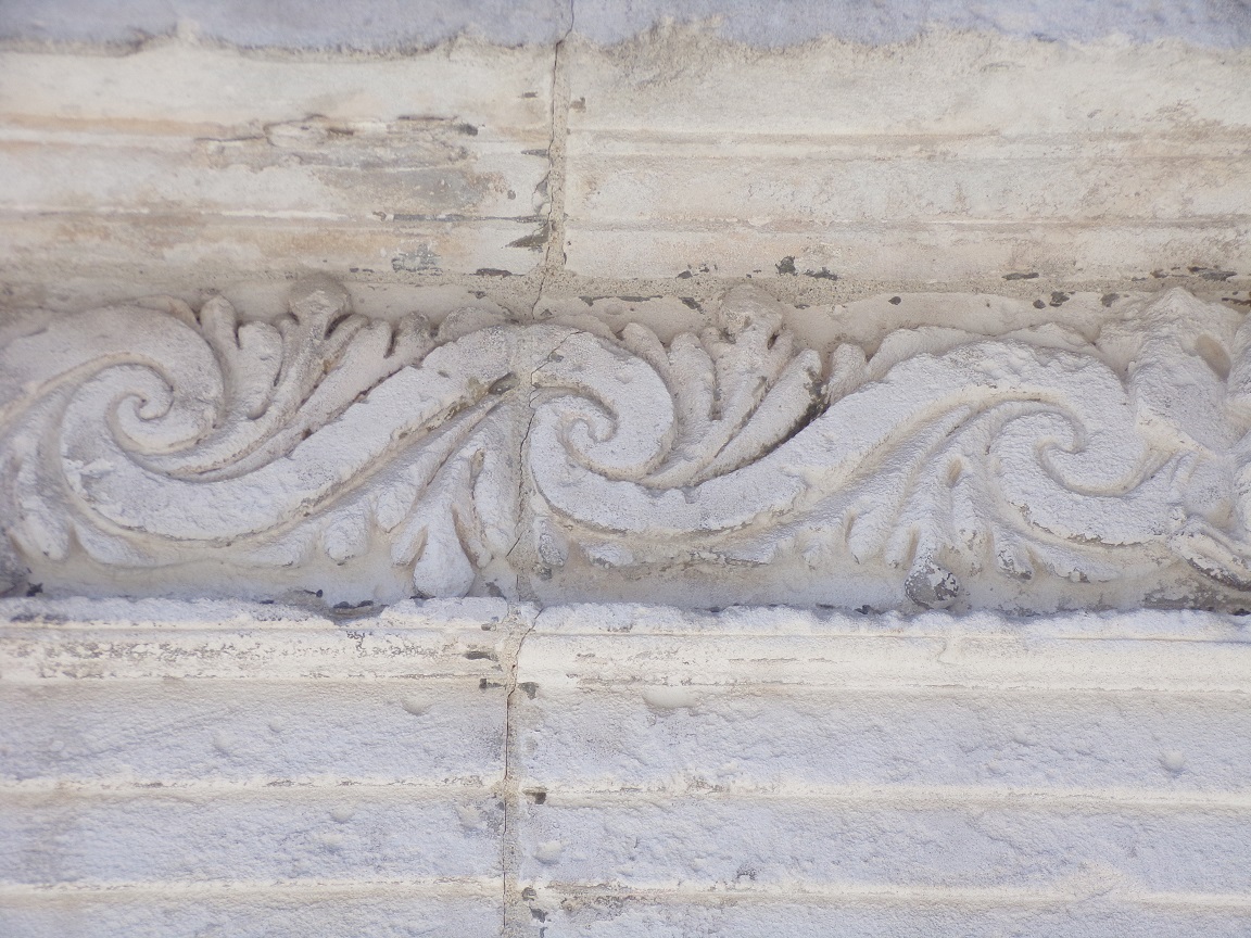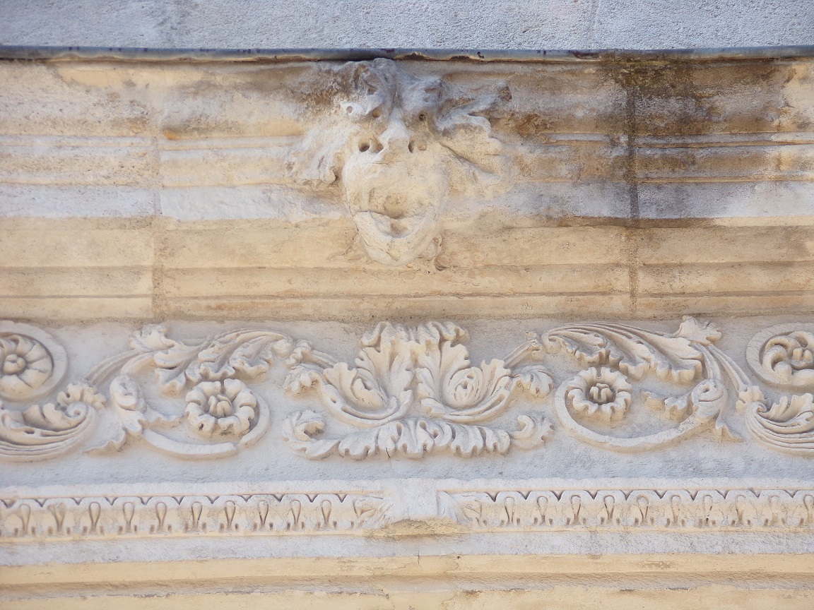 L’entablement est décoré d’une frise de feuillages et d’enroulements. Deux pots à feu assez plats encadrent le fronton.